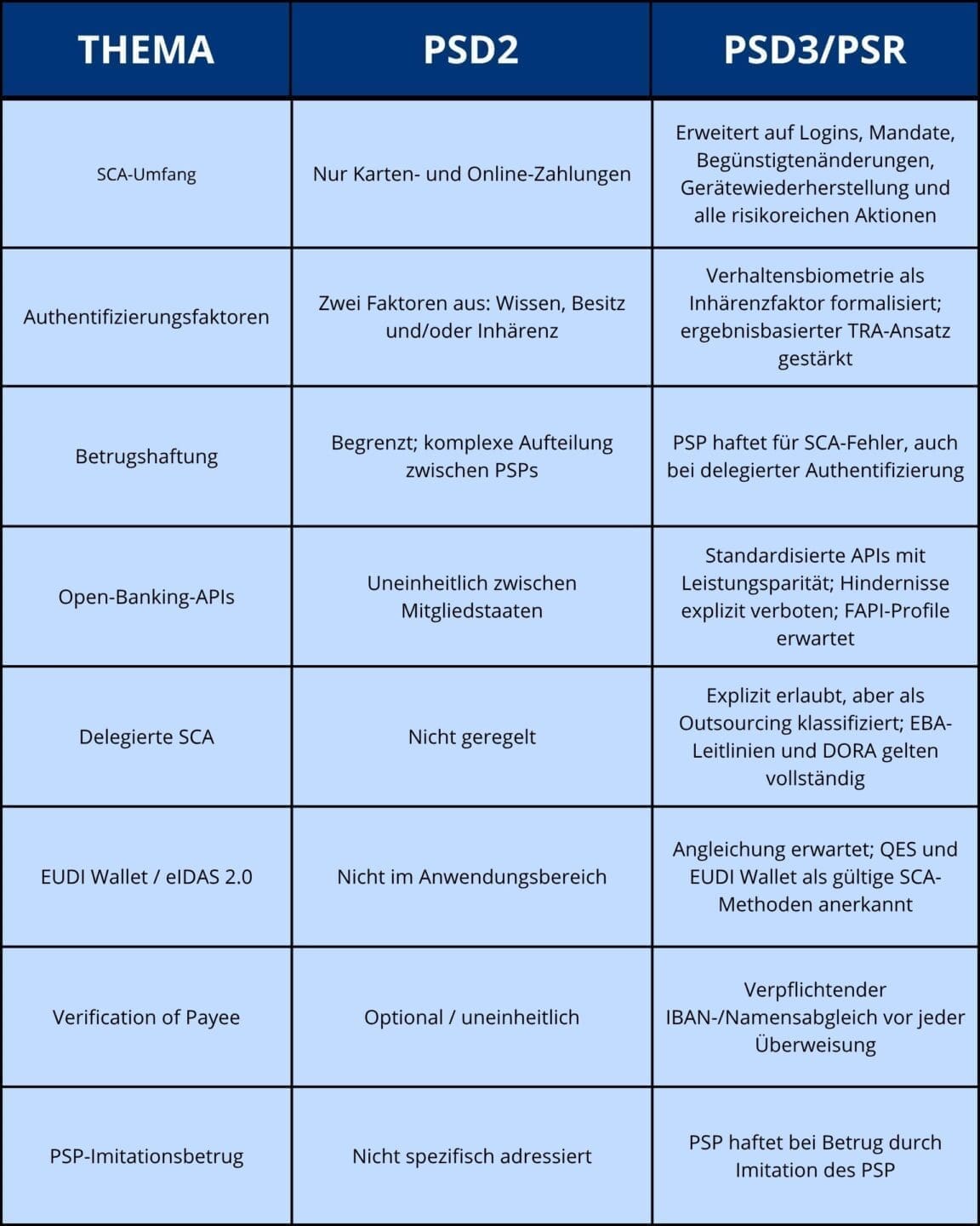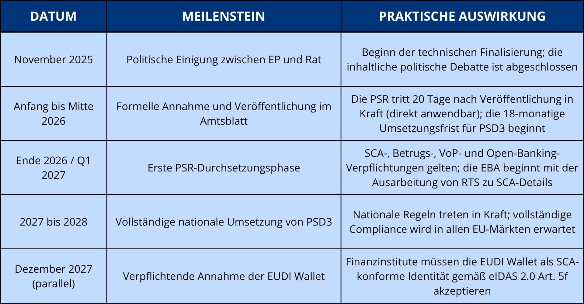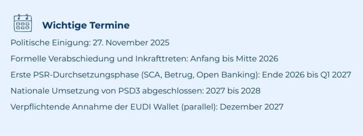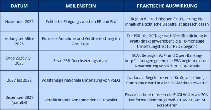 Ein praktischer Hinweis zur Aufteilung PSR/PSD3: Die PSR enthält die meisten operativen Regeln, einschließlich SCA, Betrug, Transparenz und Open-Banking-Verpflichtungen, und tritt direkt 20 Tage nach Veröffentlichung in Kraft, ohne nationale Umsetzung. PSD3 regelt die Lizenzierung und institutionelle Aufsicht von Zahlungsinstituten und erfordert eine 18-monatige Umsetzungsfrist. Zentrale SCA- und Haftungsregeln werden daher durchsetzbar sein, bevor nationale PSD3-Regeln vollständig gelten.
