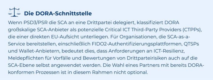 Die PSR erlaubt ausdrücklich die Delegated Authentication (DA): Ein PSP kann die SCA an eine Drittpartei delegieren, etwa einen digitalen Wallet-Anbieter, ein Zahlungs-Gateway oder einen Vertrauensdiensteanbieter. Dies ist ein wesentlicher Enabler für Embedded Finance und Open-Banking-Innovation. Allerdings klassifiziert die PSR die Delegation als Outsourcing, wodurch die vollständige Anwendung der EBA-Outsourcing-Leitlinien sowie der DORA-Anforderungen an ICT-Risiken ausgelöst wird. Der delegierende PSP behält die volle Haftung für SCA-Fehler.