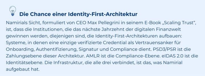 Wenn AMLR ab Juli 2027 gilt, wird die regulatorische Überlappung operativ entscheidend: Eine Institution, die eine EUDI-Wallet-Credential für KYC gemäß Artikel 22 AMLR akzeptiert, erfüllt gleichzeitig die SCA-Anforderung der PSR für dieselbe Kundeninteraktion. Dies ist die Konvergenz, die Infrastrukturinvestitionen strategisch macht und nicht nur compliance-getrieben. Eine einzelne qualifizierte Identität, einmal verifiziert nach ETSI TS 119 461 v2.1.1, kann als Vertrauensanker für KYC, SCA und regulierte Dokumentensignatur im selben Workflow dienen.