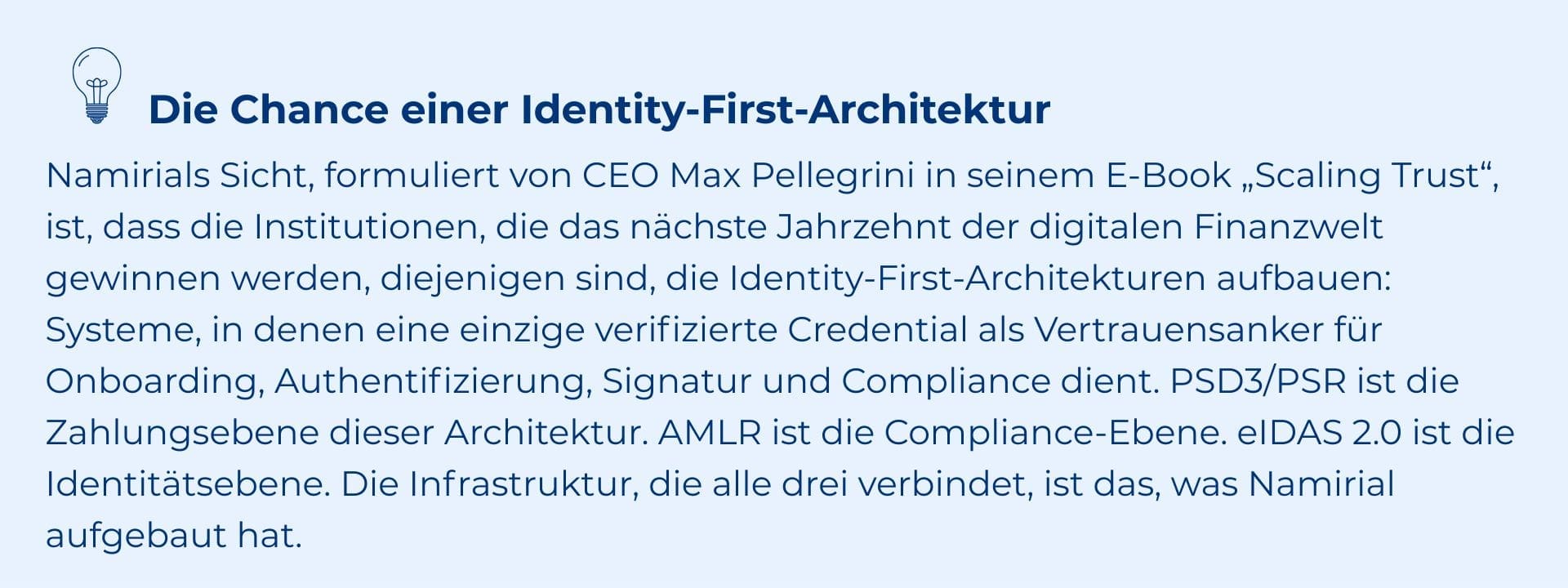 Bei Namirial sehen wir PSD3/PSR als eines der klarsten Beispiele für das, was wir in unseren Prognosen für 2026 beschrieben haben: Zahlungen, digitale Identität und Strong Customer Authentication konvergieren zu einer einheitlichen Vertrauensinfrastruktur. Die regulatorischen Rahmenwerke verlaufen nicht mehr parallel. PSD3/PSR, AMLR und eIDAS 2.0 konvergieren hin zu einer gemeinsamen Architektur für Identitätsprüfung, Authentifizierung und Transaktionsautorisierung. Organisationen, die heute auf diese Konvergenz ausrichten, werden morgen einen strukturellen Compliance-Vorteil haben.