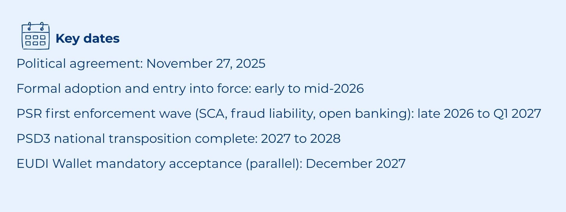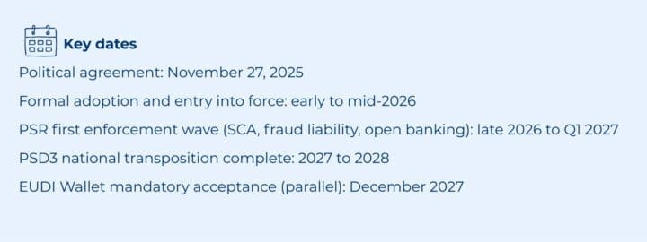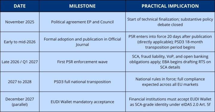 A practical note on the PSR/PSD3 split: the PSR contains most operational rules, including SCA, fraud, transparency, and open banking obligations, and enters into force directly 20 days after publication, without national transposition. PSD3 governs licensing and institutional supervision of payment institutions and requires an 18-month transposition period. Core SCA and fraud liability obligations will therefore be enforceable before national PSD3 rules are fully in place.