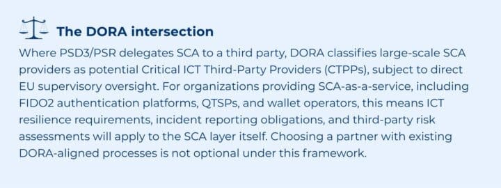 The combined effect is a substantially heavier compliance burden on PSPs and their technology partners, with expanded liability flowing down the delegation chain. For organizations providing SCA services to PSPs, including QTSPs, IAM providers, and wallet operators, PSD3/PSR is a direct regulatory event, not a downstream consideration.