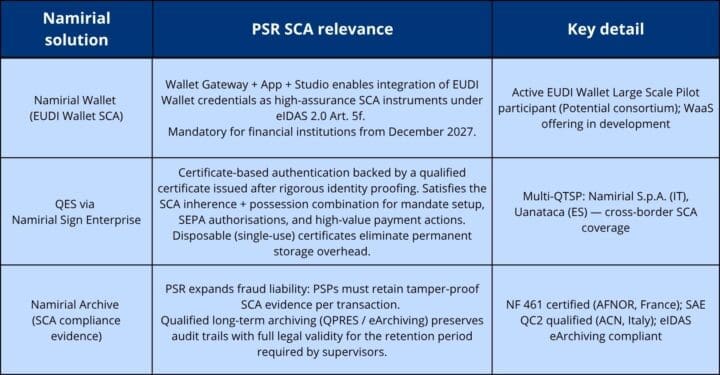 Qualified Electronic Signatures, issued by Namirial’s multi-QTSP infrastructure across Italy, Spain and France, provide certificate-based authentication that exceeds most PSD2 SCA implementations. Under PSR, QES-backed authentication is directly applicable for mandate setup, SEPA authorizations, and regulated onboarding workflows where identity certainty is required.