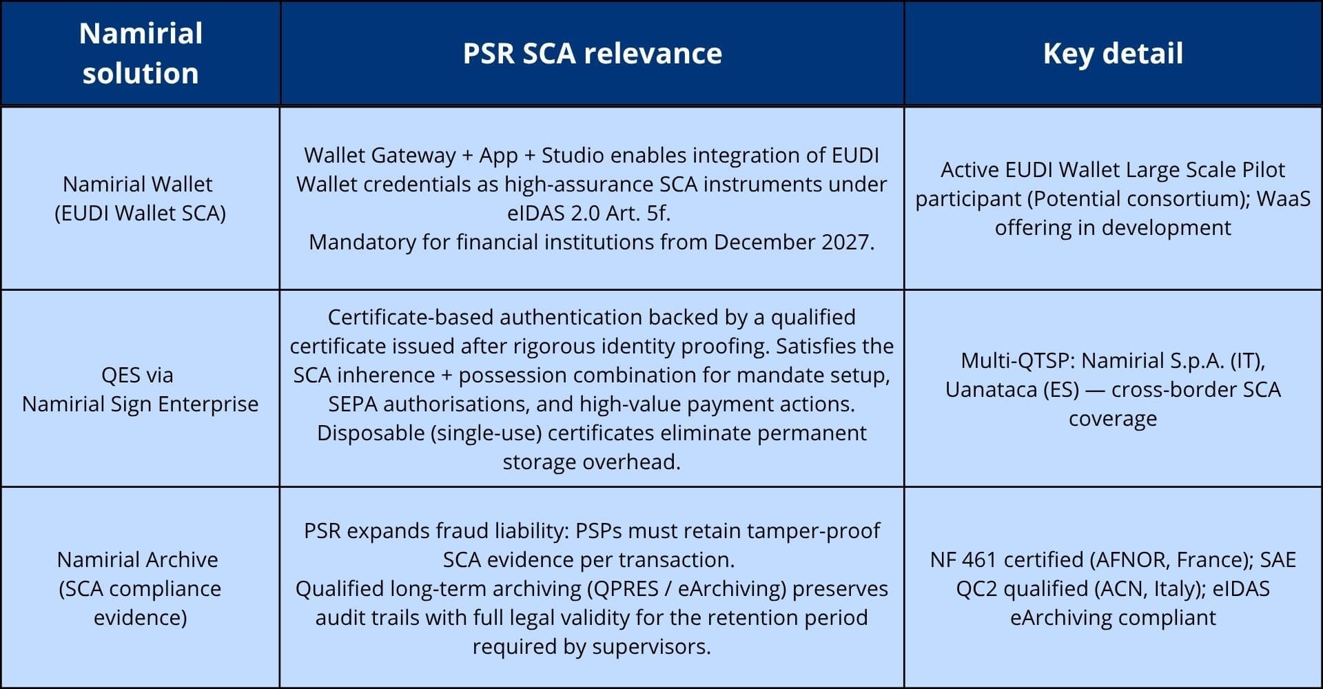 Namirial is a Qualified Trust Service Provider (QTSP) under eIDAS, operating across multiple European markets through Namirial S.p.A. (Italy), Uanataca (Spain). Our platform covers the full SCA stack required by PSD3/PSR: EUDI Wallet infrastructure, qualified certificate-based signing, federated eID integration, and qualified compliance archiving.