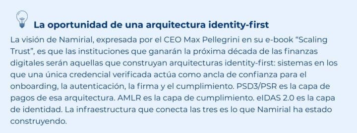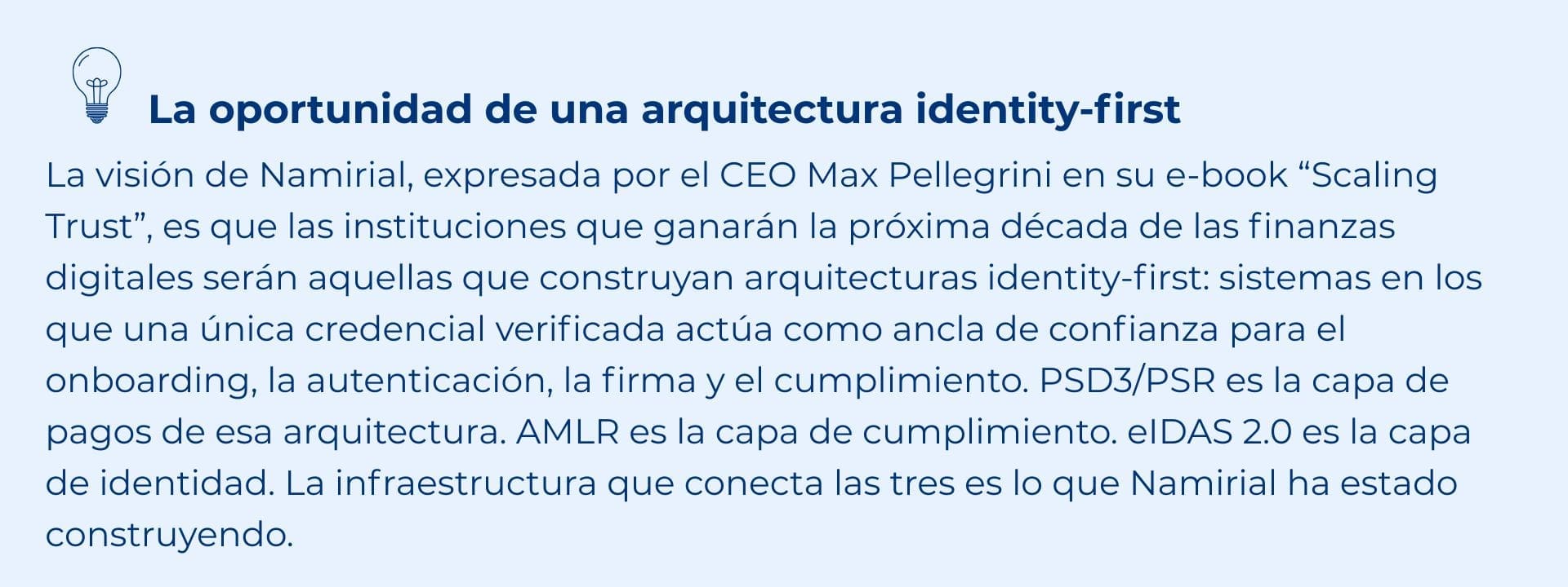 At Namirial, we see PSD3/PSR as one of the clearest examples of what we described in our predictions for 2026: payments, digital identity, and Strong Customer Authentication are converging into a single trust infrastructure. The regulatory frameworks are not parallel tracks anymore. PSD3/PSR, AMLR, and eIDAS 2.0 are converging around a shared architecture for identity verification, authentication, and transaction authorization. Organizations that build for this convergence today will hold a structural compliance advantage tomorrow.